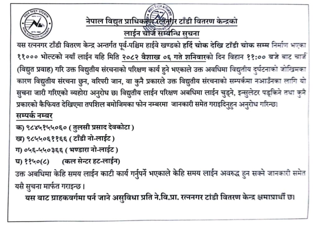 रत्ननगर, बैशाख ५ । नेपाल विद्युत प्राधिकरण रत्ननगर टाँडी वितरण केन्द्रले पूर्व(पश्चिम हाइवे खण्डको हर्दि चोकदेखि टाँडी चोकसम्म निर्माण गरिएको ११ हजार भोल्टको नयाँ विद्युत लाइनको परीक्षण गर्ने भएको छ।